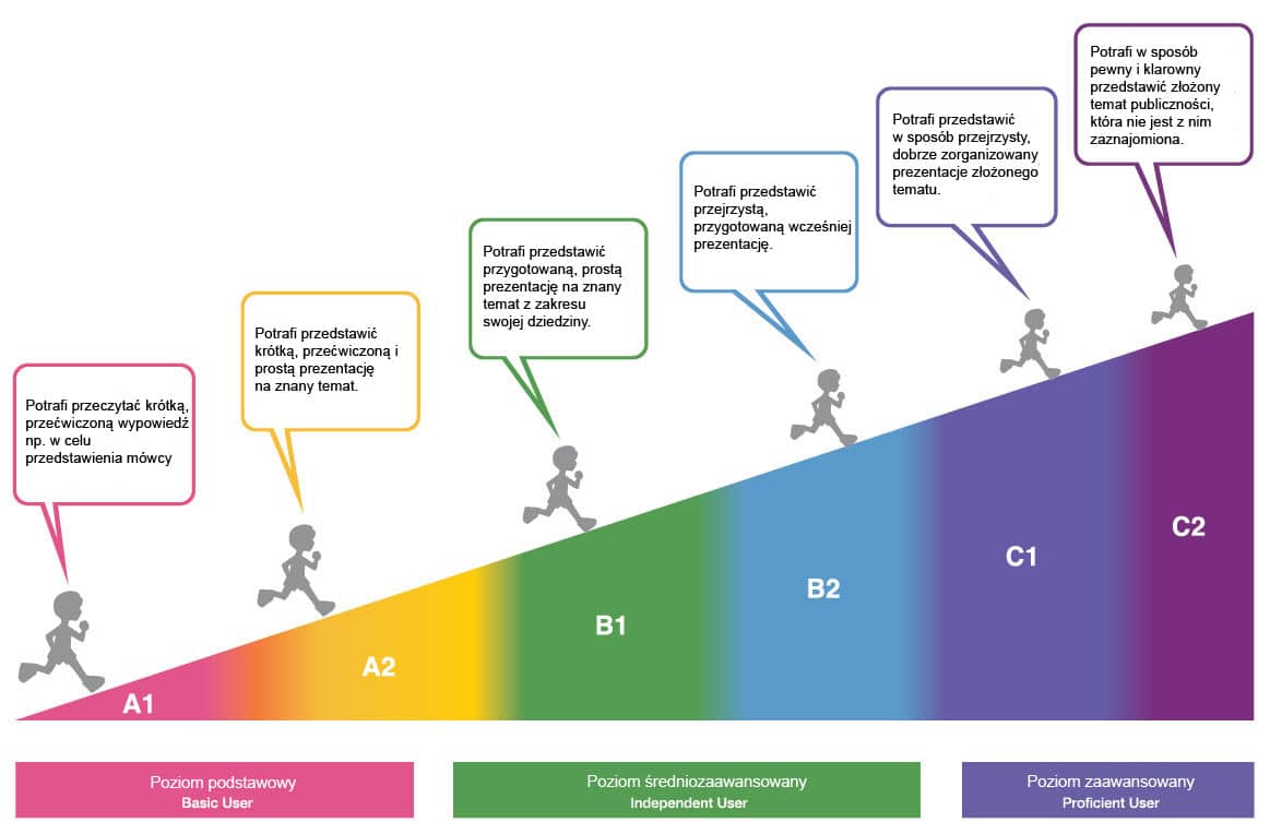 - Potrafi wypowiadać się płynnie i spontanicznie, bez zbyt widocznego szukania określeń Potrafi używać języka w sposób elastyczny i skuteczny dla celów społecznych, akademickich i zawodowych Potrafi tworzyć przejrzyste, dobrze zbudowane, szczegółowe teksty na złożone tematy, wykazując kontrolowane użycie schematów organizacyjnych, łączników i środków spajających